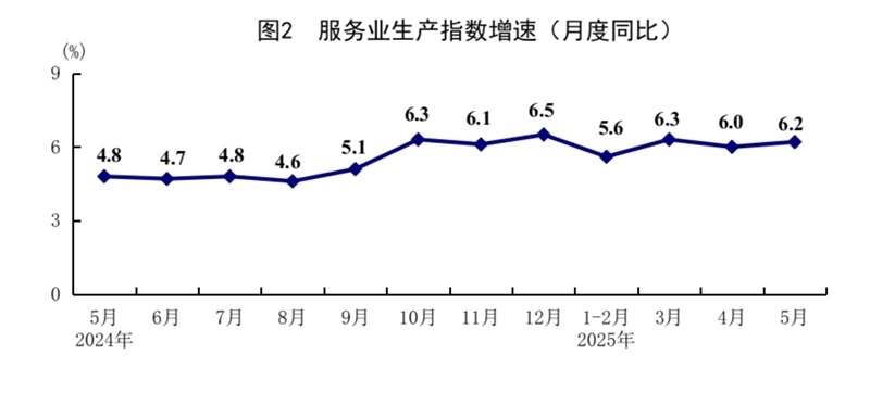 5月份,全國服務(wù)業(yè)生產(chǎn)指數(shù)同比增長6.2%,比上月加快0.2個百分點。分行業(yè)看,信息傳輸、軟件和信息技術(shù)服務(wù)業(yè),租賃和商務(wù)服務(wù)業(yè),批發(fā)和零售業(yè)生產(chǎn)指數(shù)同比分別增長11.2%、8.9%、8.4%,分別快于服務(wù)業(yè)生產(chǎn)指數(shù)5.0、2.7、2.2個百分點。1—5月份,全國服務(wù)業(yè)生產(chǎn)指數(shù)同比增長5.9%。1—4月份,規(guī)模以上服務(wù)業(yè)企業(yè)營業(yè)收入同比增長7.2%。5月份,服務(wù)業(yè)商務(wù)活動指數(shù)為50.2%,比上月上升0.1個百分點;服務(wù)業(yè)業(yè)務(wù)活動預(yù)期指數(shù)為56.5%,上升0.1個百分點。其中,鐵路運(yùn)輸、航空運(yùn)輸、郵政、電信廣播電視及衛(wèi)星傳輸服務(wù)、互聯(lián)網(wǎng)軟件及信息技術(shù)服務(wù)等行業(yè)商務(wù)活動指數(shù)位于55.0%以上較高景氣區(qū)間。