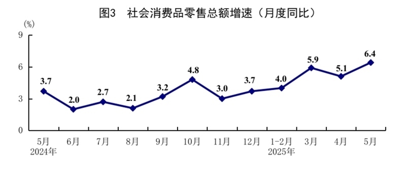 5月份,社會消費品零售總額41326億元,同比增長6.4%,比上月加快1.3個百分點;環(huán)比增長0.93%。按經(jīng)營單位所在地分,城鎮(zhèn)消費品零售額36057億元,同比增長6.5%;鄉(xiāng)村消費品零售額5269億元,增長5.4%。按消費類型分,商品零售額36748億元,增長6.5%;餐飲收入4578億元,增長5.9%?;旧铑惡筒糠稚夘惿唐蜂N售增勢較好,限額以上單位糧油食品類、金銀珠寶類、體育娛樂用品類商品零售額分別增長14.6%、21.8%、28.3%。消費品以舊換新政策持續(xù)顯效,限額以上單位家用電器和音像器材類、通訊器材類、文化辦公用品類、家具類商品零售額分別增長53.0%、33.0%、30.5%、25.6%。1—5月份,社會消費品零售總額203171億元,同比增長5.0%。全國網(wǎng)上零售額60402億元,同比增長8.5%。其中,實物商品網(wǎng)上零售額49878億元,增長6.3%,占社會消費品零售總額的比重為24.5%。1—5月份,服務(wù)零售額同比增長5.2%。
