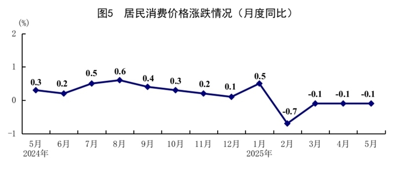 5月份,全國居民消費價格(CPI)同比下降0.1%,環(huán)比下降0.2%。分類別看,食品煙酒價格同比上漲0.1%,衣著價格上漲1.5%,居住價格上漲0.1%,生活用品及服務(wù)價格上漲0.1%,交通通信價格下降4.3%,教育文化娛樂價格上漲0.9%,醫(yī)療保健價格上漲0.3%,其他用品及服務(wù)價格上漲7.3%。在食品煙酒價格中,鮮菜價格下降8.3%,糧食價格下降1.4%,豬肉價格上漲3.1%,鮮果價格上漲5.5%。扣除食品和能源價格后的核心CPI同比上漲0.6%,漲幅比上月擴(kuò)大0.1個百分點。1—5月份,全國居民消費價格同比下降0.1%。