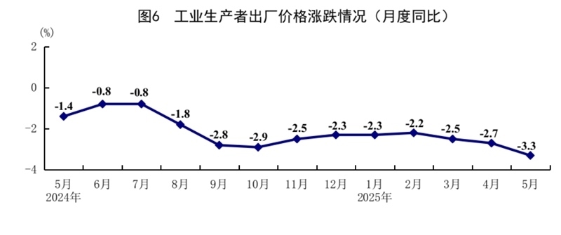 5月份,全國工業(yè)生產(chǎn)者出廠價格同比下降3.3%,環(huán)比下降0.4%;全國工業(yè)生產(chǎn)者購進(jìn)價格同比下降3.6%,環(huán)比下降0.6%。1—5月份,全國工業(yè)生產(chǎn)者出廠價格和購進(jìn)價格均比上年同期下降2.6%。