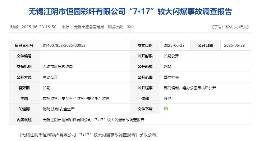調(diào)查認(rèn)定,無錫江陰市恒園彩纖有限公司“7·17”較大閃爆事故是一起因崗位員工盲目操作,生產(chǎn)單元安全設(shè)施缺失,現(xiàn)場(chǎng)應(yīng)急處置不當(dāng),地方黨委、政府及其有關(guān)部門履職不到位而導(dǎo)致的較大生產(chǎn)安全責(zé)任事故。