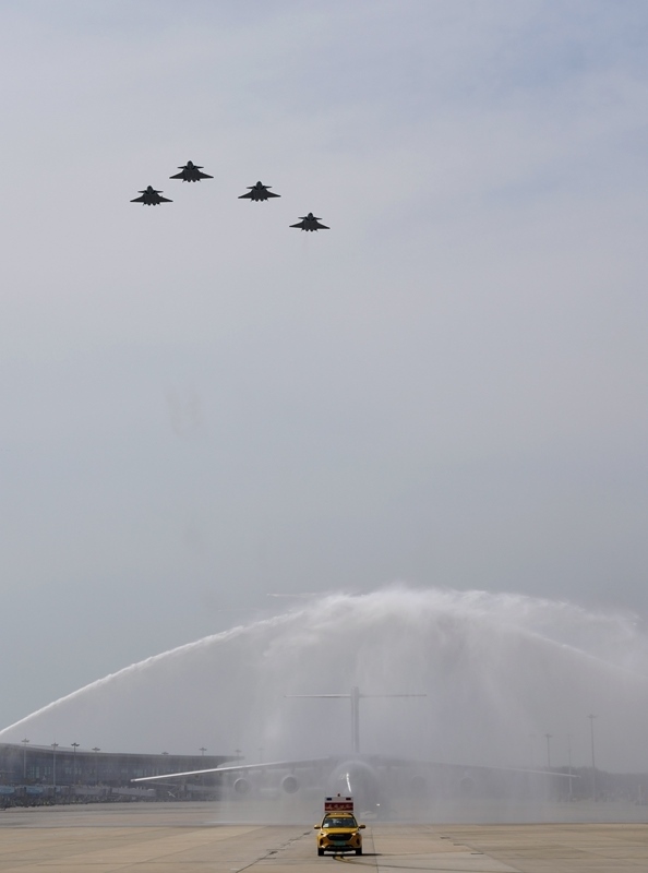 9月12日,第十二批在韓中國(guó)人民志愿軍烈士遺骸回國(guó)。這是在沈陽(yáng)桃仙國(guó)際機(jī)場(chǎng),接運(yùn)烈士遺骸回國(guó)的運(yùn)-20專機(jī)通過(guò)水門。