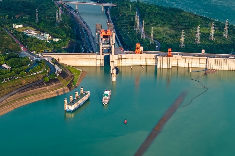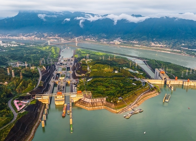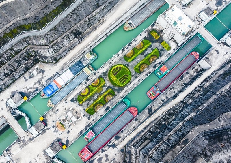 7月1日,在湖北宜昌,船舶有序通過三峽雙線五級(jí)船閘和升船機(jī)(無(wú)人機(jī)照片)。