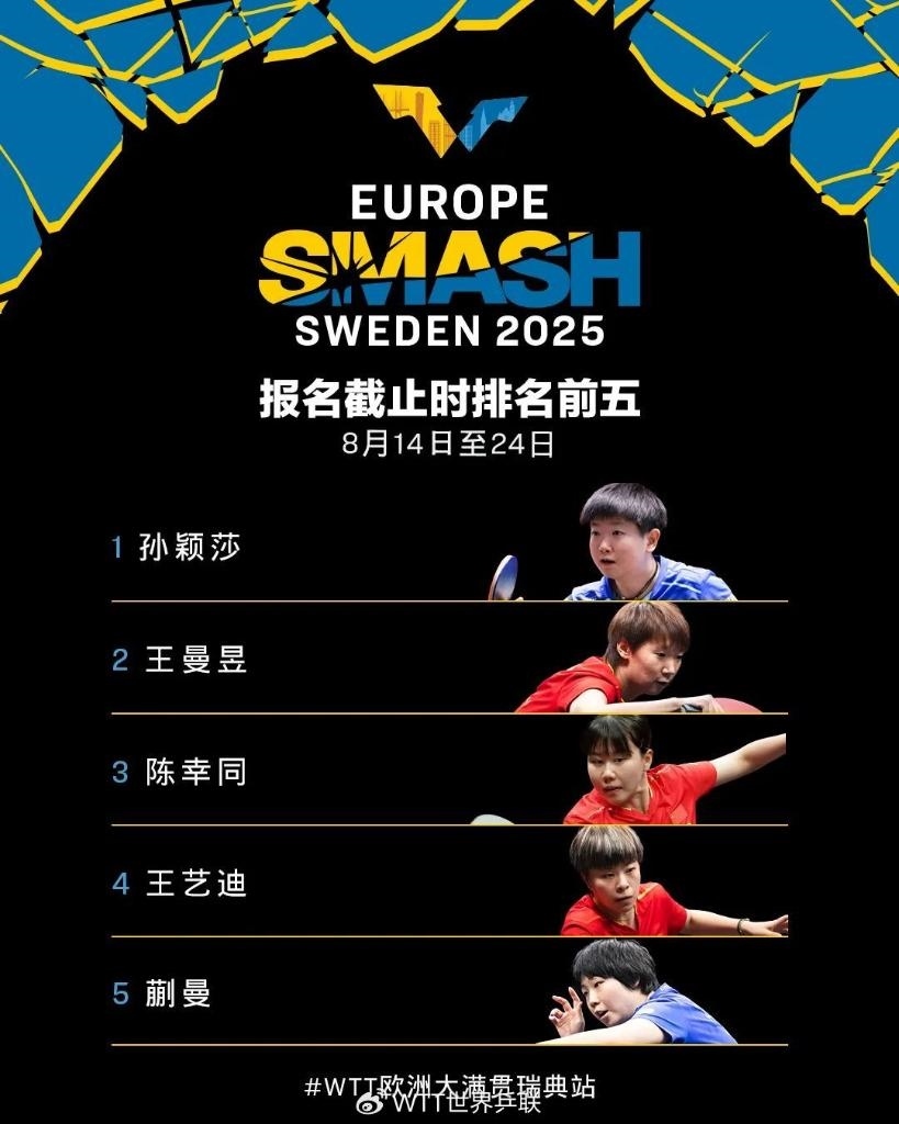 新華社北京7月6日電 世界乒乓球職業(yè)大聯(lián)盟(WTT)歐洲大滿貫賽瑞典站將于8月14日至24日在馬爾默舉行。首批參賽名單6日公布,男、女單打世界排名第一的國乒隊(duì)員林詩棟、孫穎莎在列。