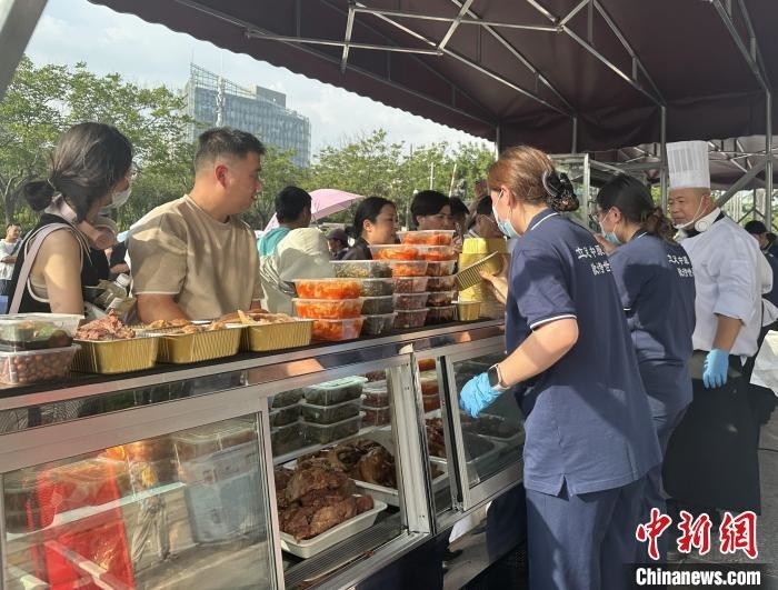 近日傍晚,該酒店外擺攤位推出了熟食、涼菜、主食及高檔特色菜,攤位前排起長(zhǎng)隊(duì)。四五十位酒店服務(wù)人員統(tǒng)一身著工作服,忙著招呼顧客。