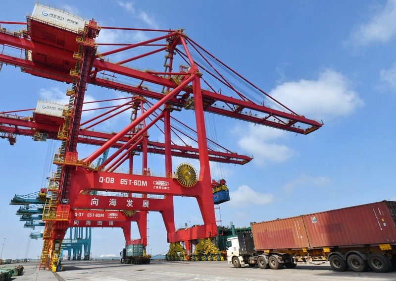 7月16日,工人在黃驊港綜合港區(qū)集裝箱碼頭操作吊裝設(shè)備進(jìn)行裝船作業(yè)。