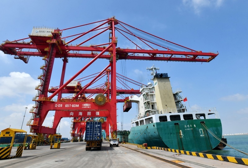 7月16日,一艘輪船靠泊在黃驊港綜合港區(qū)集裝箱碼頭裝貨(無人機(jī)照片)。