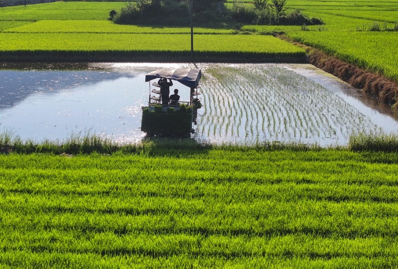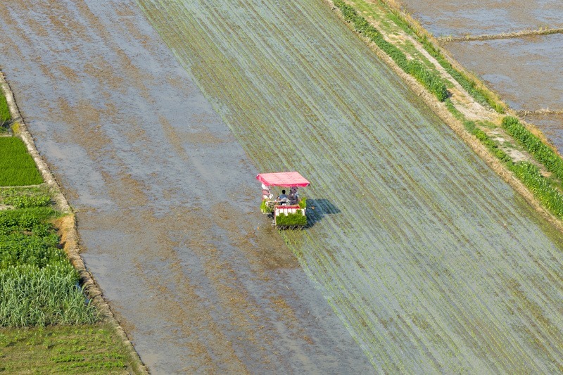 7月15日,在湖南省衡陽市衡山縣福田鋪鄉(xiāng),村民駕駛農(nóng)機(jī)進(jìn)行晚稻插秧工作(無人機(jī)照片)。