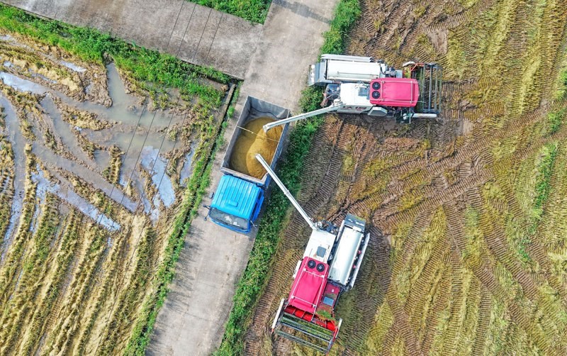 7月15日,在浙江省臺州市仙居縣下各鎮(zhèn),農(nóng)民將剛收割的稻谷裝車(無人機(jī)照片)。