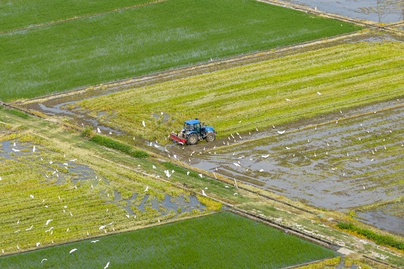 7月14日,在浙江省余姚市黃家埠鎮(zhèn)五車堰村,農(nóng)民駕駛農(nóng)機(jī)翻耕農(nóng)田(無人機(jī)照片)。