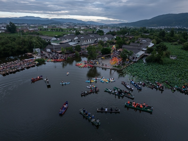 7月19日,人們?cè)诖罄砦骱g度水上火把節(jié)(無人機(jī)照片)。
