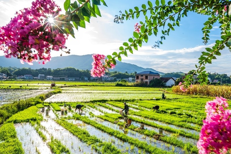 7月21日,農(nóng)民在湖南省婁底市雙峰縣荷葉鎮(zhèn)長塘村的田間插秧。