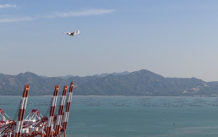 豐翼科技(深圳)有限公司的一架無人機搭載著快件從深圳蛇口集裝箱碼頭附近的起降點起飛,準備飛往中山(2024年11月27日攝)。新華社記者 毛思倩 攝