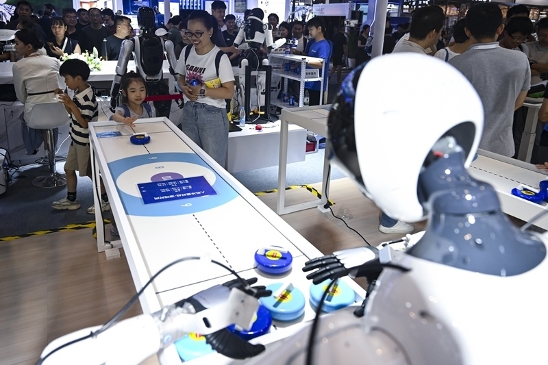7月29日,小朋友在和一款機器人玩冰壺游戲。