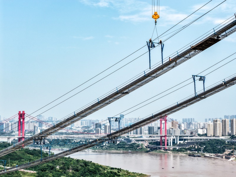 當(dāng)日,由重慶城投集團(tuán)投資、城投建設(shè)公司組織建設(shè)、中國(guó)鐵建大橋局承建的黃桷沱長(zhǎng)江大橋順利完成主纜架設(shè)工作,標(biāo)志著大橋建設(shè)即將進(jìn)入鋼桁梁吊裝工序。黃桷沱長(zhǎng)江大橋全長(zhǎng)1260米,主跨765米,為單跨懸吊雙塔三跨連續(xù)鋼桁梁懸索橋,是國(guó)內(nèi)最大跨徑公軌兩用懸索橋。黃桷沱長(zhǎng)江大橋是渝長(zhǎng)高速?gòu)?fù)線連接道工程的控制性節(jié)點(diǎn)工程,建成后將成為聯(lián)系重慶主城區(qū)長(zhǎng)江南北兩岸的重要交通干道。