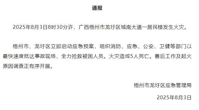 記者從廣西梧州市龍圩區(qū)應(yīng)急管理局了解到,8月3日8時(shí)30分許,梧州市龍圩區(qū)城南大道一居民樓發(fā)生火災(zāi)。梧州市、龍圩區(qū)啟動應(yīng)急預(yù)案,組織消防、應(yīng)急、公安、衛(wèi)健等部門抵達(dá)事故現(xiàn)場,搶救被困人員?;馂?zāi)造成5人死亡。善后工作及起火原因調(diào)查正有序開展。