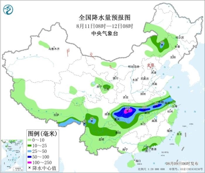 8月10日08時至11日08時,陜西南部、河南南部、四川大部、重慶大部、湖北大部、安徽中南部、江蘇中南部、上海、浙江北部以及內(nèi)蒙古東南部、黑龍江東北部等地部分地區(qū)有中到大雨,其中,安徽西南部、江蘇中南部、湖北東部和西南部、四川盆地中東部和西南部、重慶中西部和東北部、云南東北部等地部分地區(qū)有暴雨或大暴雨(100~150毫米)。內(nèi)蒙古西北部、新疆沿天山地區(qū)等地部分地區(qū)有4~5級風。東海北部海域?qū)⒂?~7級風、陣風8級,黃海南部海域、東海南部海域?qū)⒂?~6級風、陣風7級。