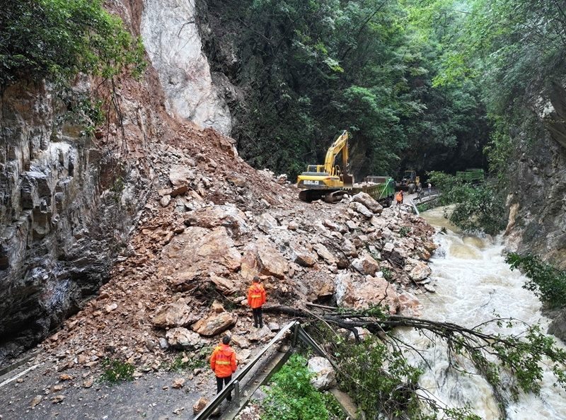 8月10日,在468省道??悼h寺坪鎮(zhèn)升石坪路段,公路養(yǎng)護部門工作人員駕駛裝載機處置路旁垮方。