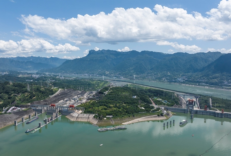 8月16日,在湖北省宜昌市,船舶有序通過三峽雙線五級船閘和三峽升船機(jī)(無人機(jī)照片)。