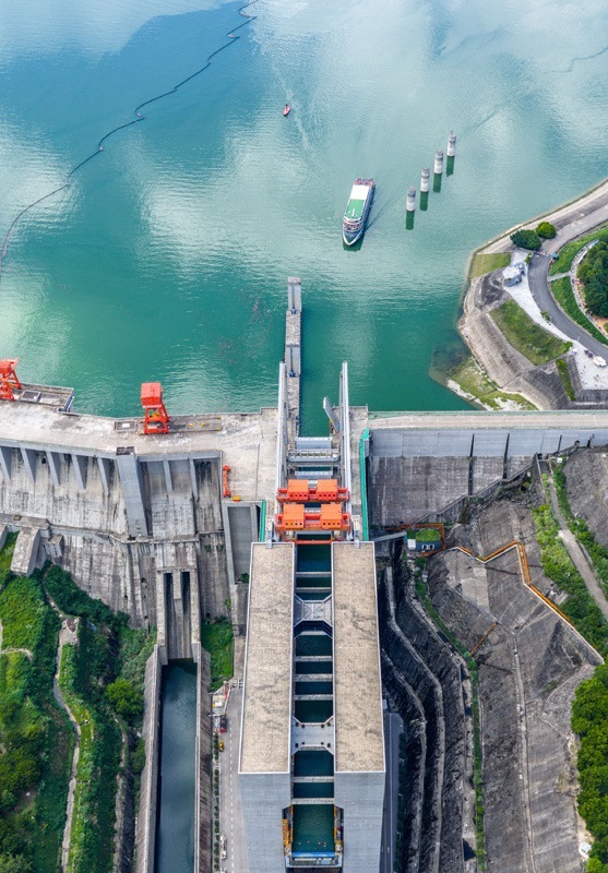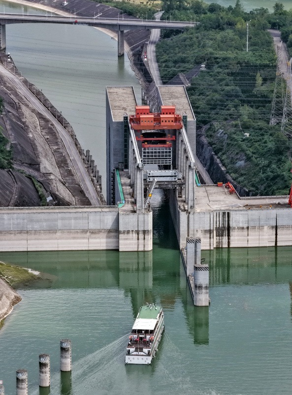 8月16日,在湖北省宜昌市,游輪滿載游客通過三峽升船機(jī)(無人機(jī)照片)。