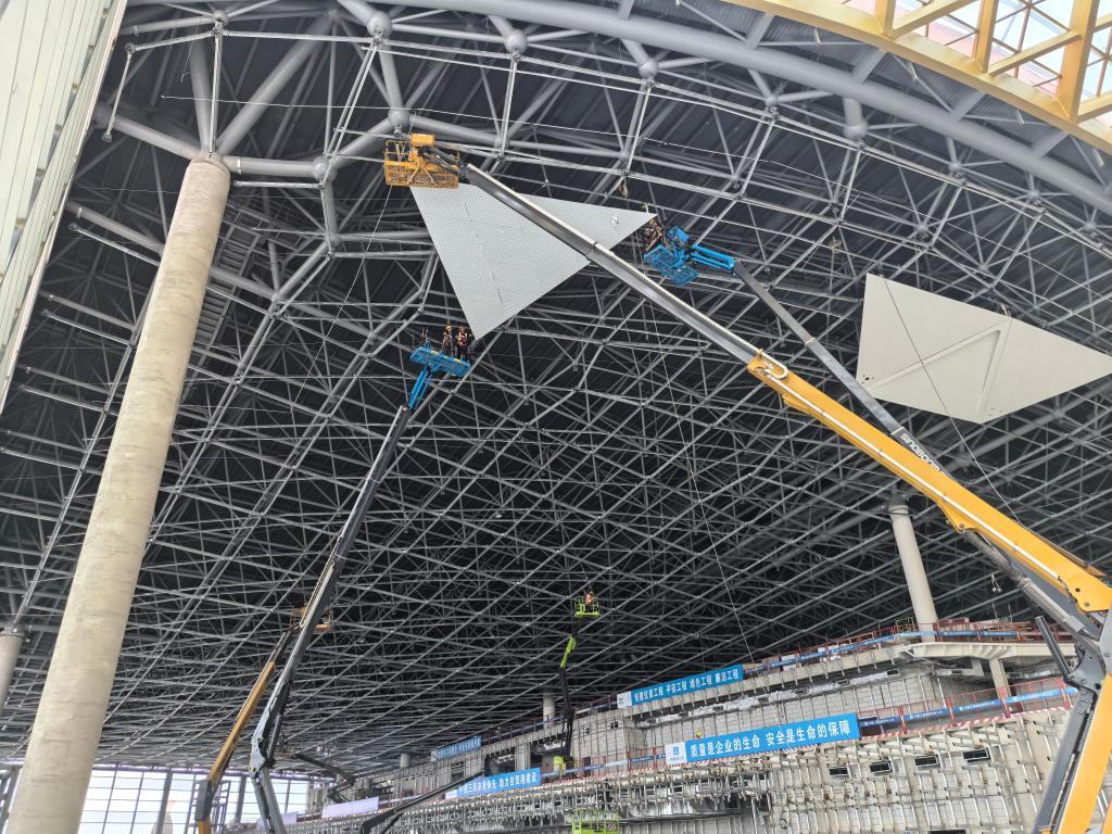 “咔嚓”,隨著兩塊蜂窩金屬鋁板精準(zhǔn)扣接,P6施工區(qū)的各吊頂模塊緊緊相扣,為“鳳凰”腹部覆蓋上精美堅(jiān)固的“銀甲”。