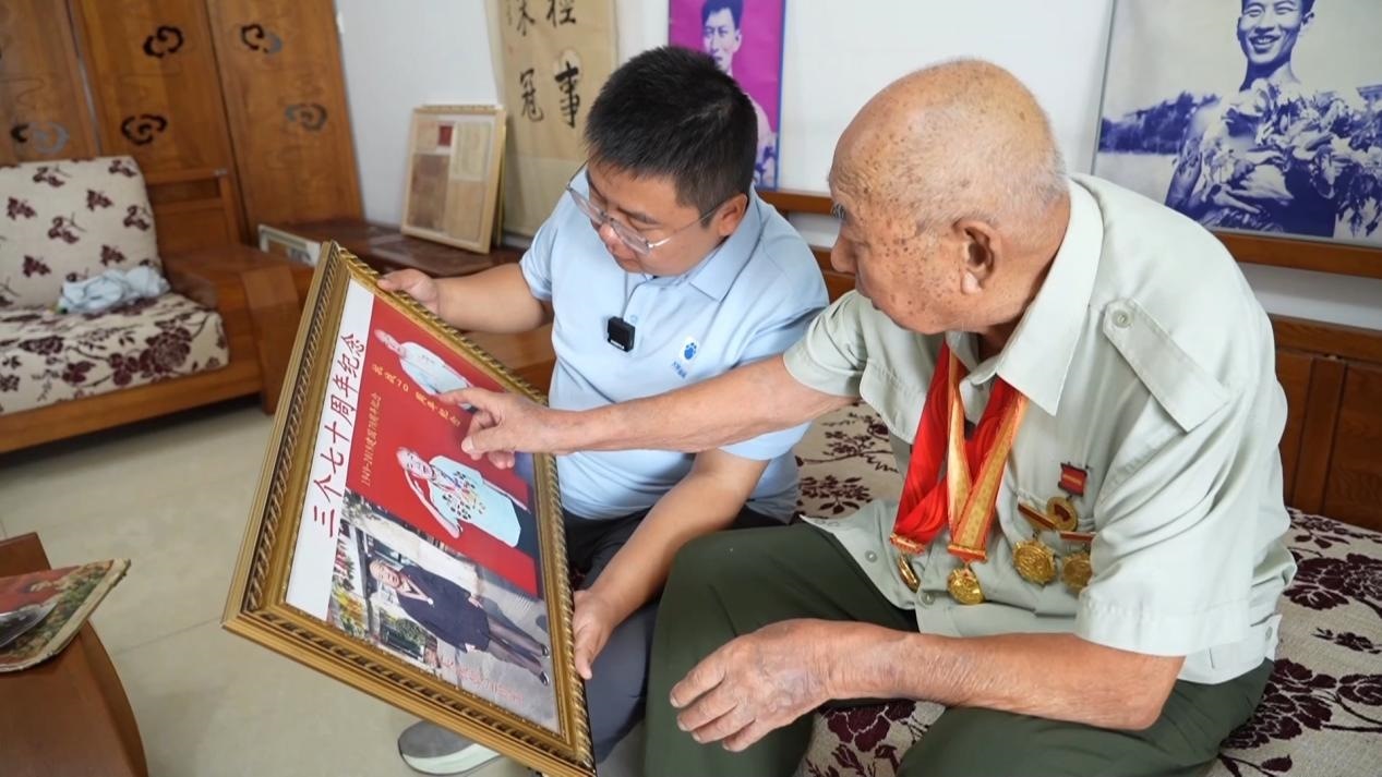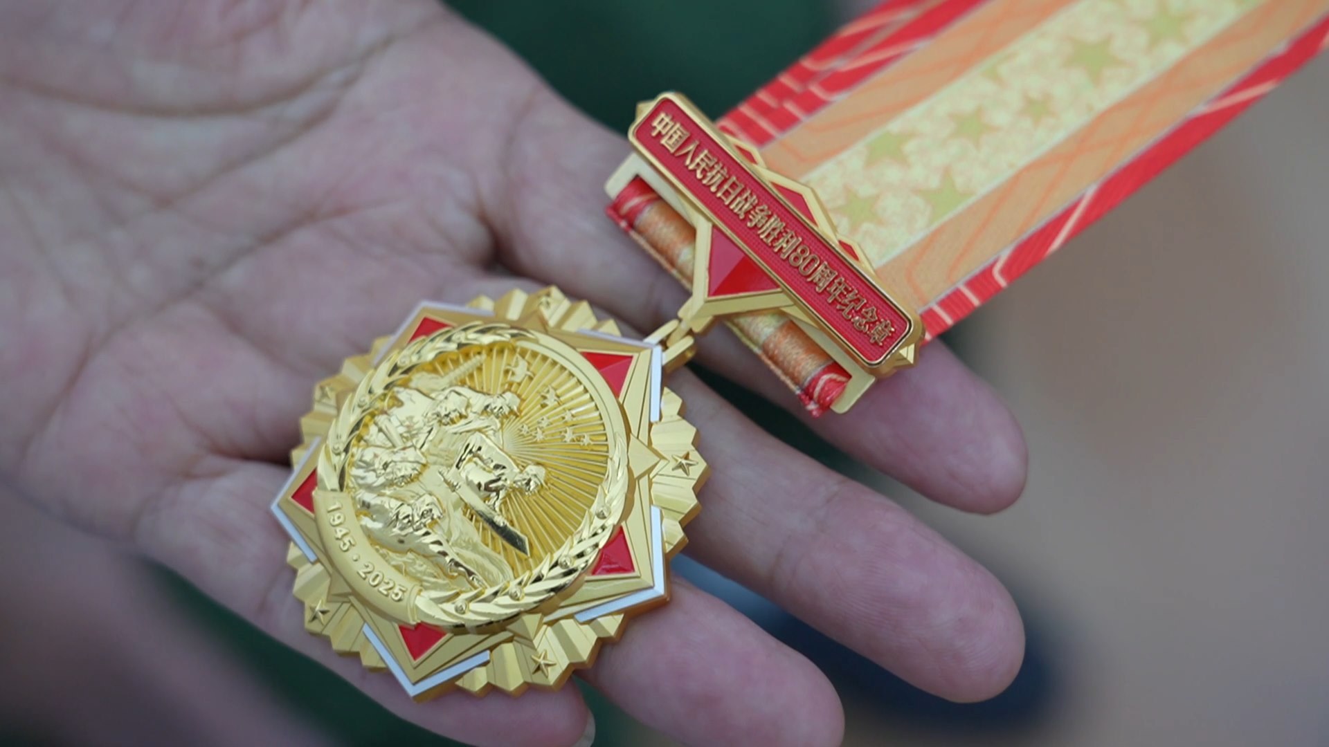 手捧“中國(guó)人民抗日戰(zhàn)爭(zhēng)勝利80周年”紀(jì)念章,