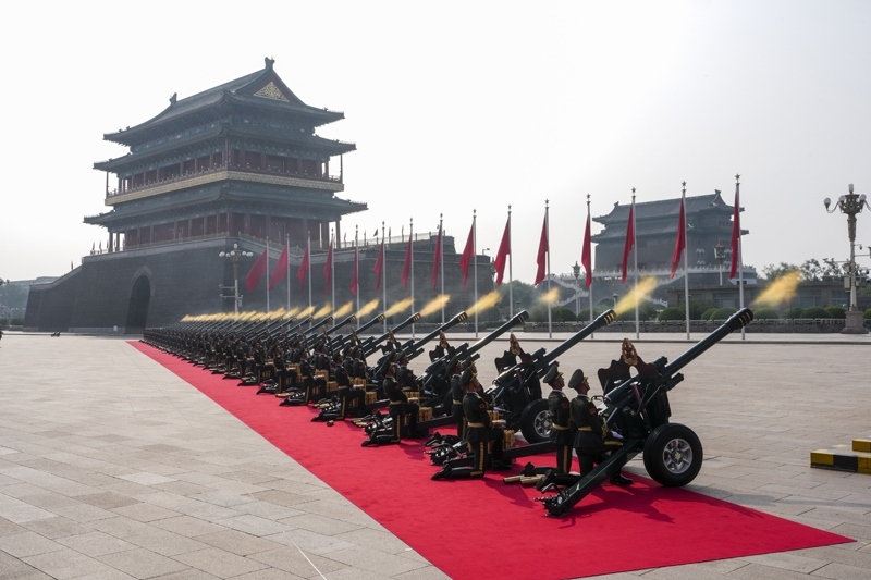 9月3日,紀(jì)念中國(guó)人民抗日戰(zhàn)爭(zhēng)暨世界反法西斯戰(zhàn)爭(zhēng)勝利80周年大會(huì)在北京隆重舉行。這是禮炮在天安門(mén)廣場(chǎng)鳴響。