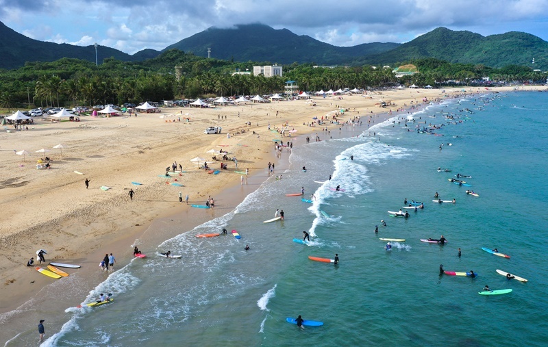 10月2日,游客在海南萬寧日月灣沖浪(無人機(jī)照片)。