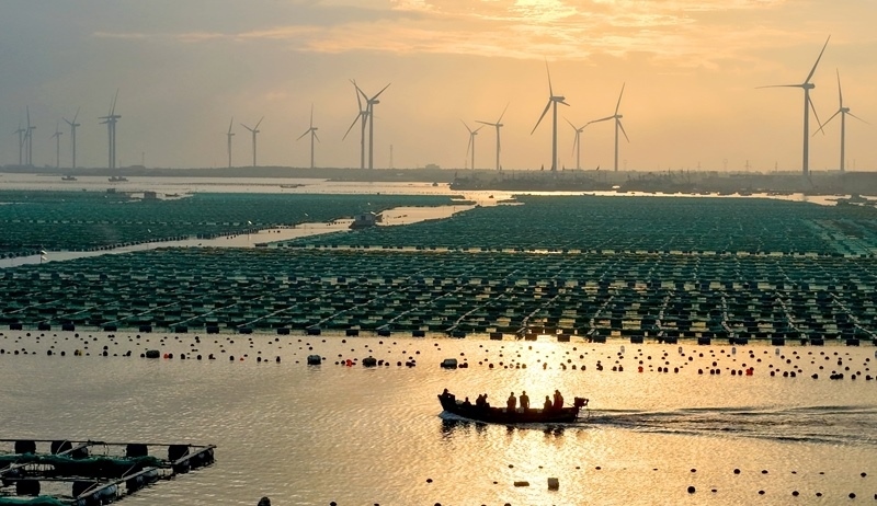 10月4日,在山東省榮成市石島管理區(qū)桑溝灣海洋牧場(chǎng),漁民出海從事養(yǎng)殖生產(chǎn)。