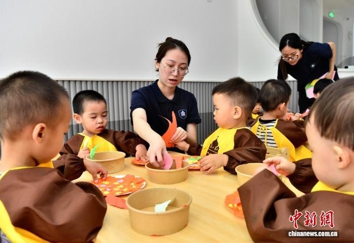 7月29日,福州新星托育園東街園老師指導(dǎo)小朋友進(jìn)行藝術(shù)創(chuàng)想,制作美味的“披薩”。近年來(lái),當(dāng)?shù)胤e極推動(dòng)公辦幼兒園和社會(huì)力量興辦發(fā)展托育教育服務(wù),以解決民眾“帶娃難”的問(wèn)題?!≈行律缬浾?張斌 攝
