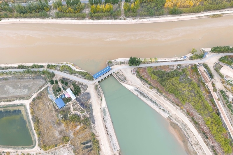 10月16日,用于灌溉的黃河水流經(jīng)內(nèi)蒙古巴彥淖爾市臨河區(qū)境內(nèi)的總干渠第二分水樞紐(無人機(jī)照片)。