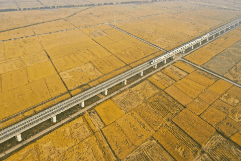 10月14日,在吉林省公主嶺市,一列高鐵列車沿著田間的鐵路線穿行(無人機(jī)照片)。2025年,吉林省深化農(nóng)機(jī)研發(fā)、制造、推廣、應(yīng)用一體化試點(diǎn)示范,農(nóng)作物耕種收綜合機(jī)械化率達(dá)94.6%。新華社記者 張楠 攝