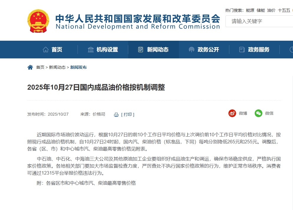 中國網(wǎng)10月27日訊 據(jù)國家發(fā)改委網(wǎng)站消息,近期國際市場油價(jià)波動運(yùn)行,根據(jù)10月27日的前10個工作日平均價(jià)格與上次調(diào)價(jià)前10個工作日平均價(jià)格對比情況,按照現(xiàn)行成品油價(jià)格機(jī)制,自10月27日24時起,國內(nèi)汽、柴油價(jià)格(標(biāo)準(zhǔn)品,下同)每噸分別降低265元和255元。調(diào)整后,各?。▍^(qū)、市)和中心城市汽、柴油最高零售價(jià)格見附表。