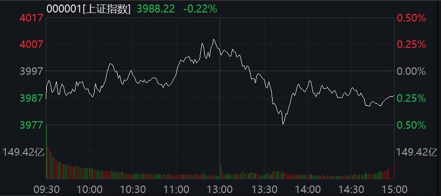 截至收盤,滬指跌0.22%,報3988.22點;深成指跌0.44%,報13430.1點;創(chuàng)業(yè)板指跌0.15%,報3229.58點。兩市合計成交21479億元,較上個交易日縮量約2000億元。