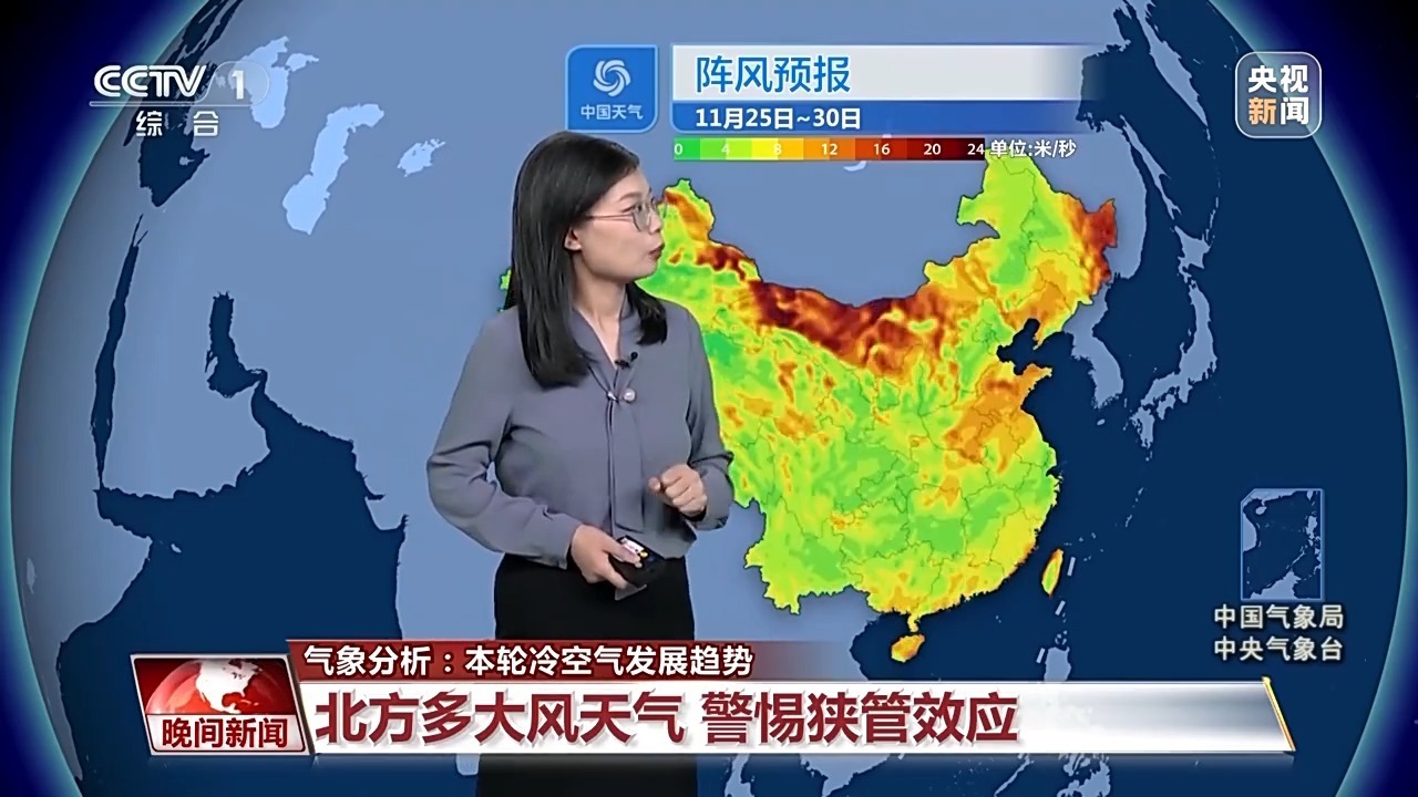 冷空氣帶來的大風(fēng)比較頻繁,尤其是25日、26日以及29日前后,從西北到華北黃淮會陸續(xù)刮起5至7級的風(fēng),陣風(fēng)可以達到8到9級,尤其是會出現(xiàn)狹管效應(yīng)的區(qū)域,風(fēng)力會更大。