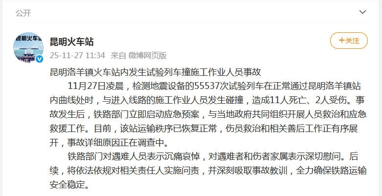 據(jù)昆明鐵路局昆明站官方微博消息,11月27日凌晨,檢測地震設(shè)備的55537次試驗列車在正常通過昆明洛羊鎮(zhèn)站內(nèi)曲線處時,與進(jìn)入線路的施工作業(yè)人員發(fā)生碰撞,造成11人死亡、2人受傷。事故發(fā)生后,鐵路部門立即啟動應(yīng)急預(yù)案,與當(dāng)?shù)卣餐M織開展人員救治和應(yīng)急救援工作。目前,該站運輸秩序已恢復(fù)正常,傷員救治和相關(guān)善后工作正有序展開,事故詳細(xì)原因正在調(diào)查中。