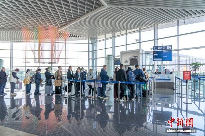 國(guó)際旅客在青島機(jī)場(chǎng)排隊(duì)準(zhǔn)備登機(jī)。(青島機(jī)場(chǎng)供圖)