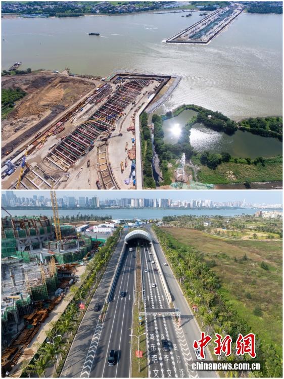 2025年12月18日,海南自由貿(mào)易港正式啟動全島封關(guān)。近年來,海南自貿(mào)港建設(shè)在利好政策帶動下不斷刷新“自貿(mào)港速度”,一個個重大項目、重點園區(qū)拔地而起,直觀呈現(xiàn)海南自貿(mào)港的蓬勃生機(jī)。這里正成為中國對外開放的新前沿、互利合作的新熱土和推動經(jīng)濟(jì)全球化的新引擎。上資料圖為2019年6月19日的??谖拿鳀|越江隧道施工現(xiàn)場,下資料圖為2025年12月7日已建成通車的海南省首條跨越南渡江隧道——文明東隧道。(拼版圖,無人機(jī)照片)