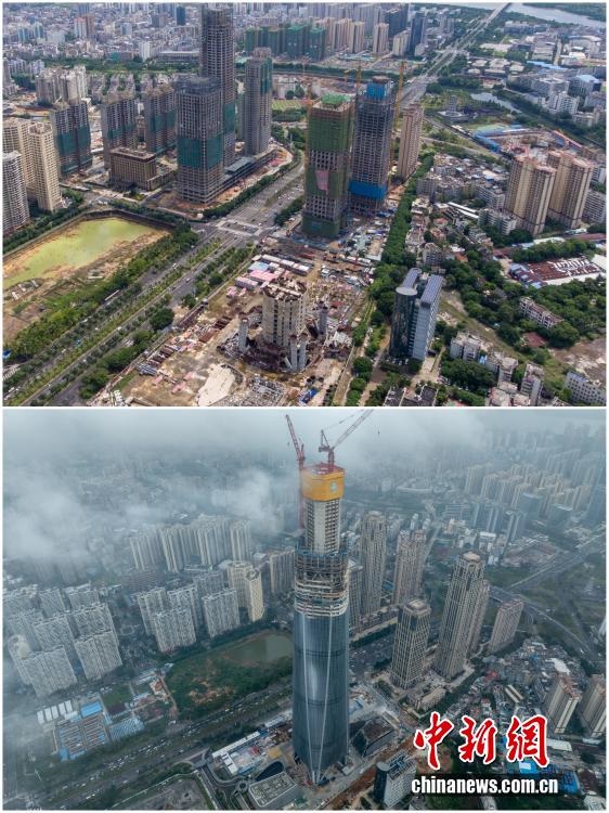 2025年12月18日,海南自由貿(mào)易港正式啟動全島封關(guān)。近年來,海南自貿(mào)港建設(shè)在利好政策帶動下不斷刷新“自貿(mào)港速度”,一個個重大項目、重點園區(qū)拔地而起,直觀呈現(xiàn)海南自貿(mào)港的蓬勃生機(jī)。這里正成為中國對外開放的新前沿、互利合作的新熱土和推動經(jīng)濟(jì)全球化的新引擎。上資料圖為2020年8月21日因故停工的“海南第一高樓”海南中心項目,下資料圖為2025年12月16日海南中心項目順利完成塔樓核心筒結(jié)構(gòu)封頂。(拼版圖,無人機(jī)照片)