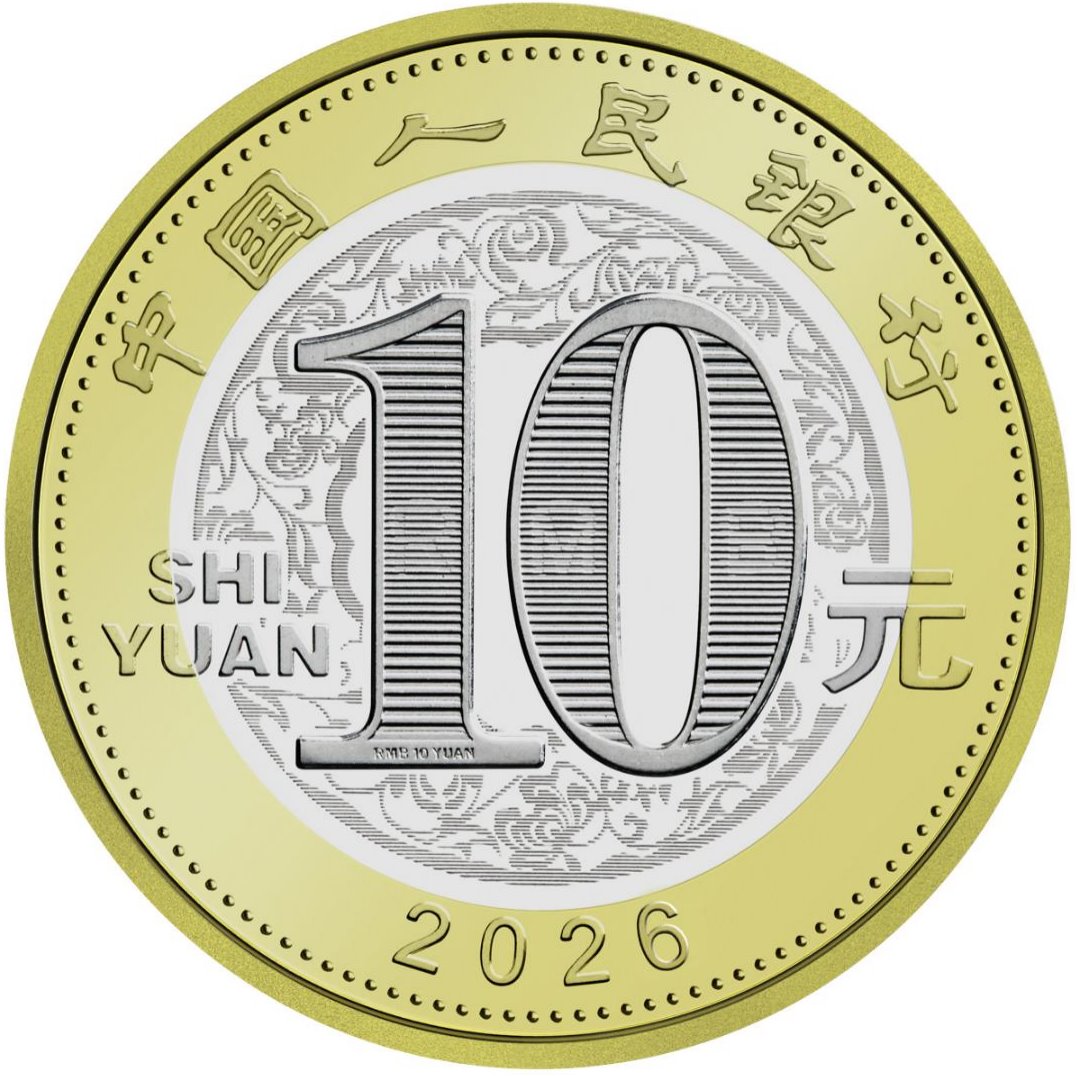 雙色銅合金紀(jì)念幣正面圖案為“中國人民銀行”、“10元”字樣,漢語拼音字母“SHIYUAN”及年號(hào)“2026”,底紋襯以團(tuán)花圖案。