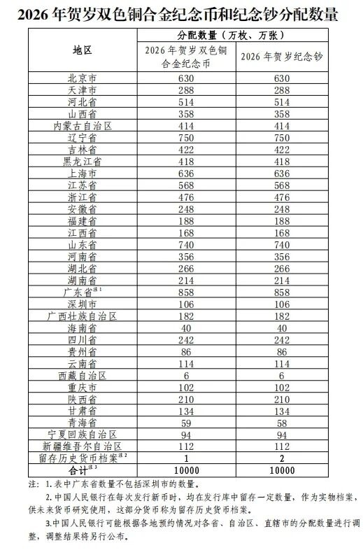 各省、自治區(qū)、直轄市雙色銅合金紀(jì)念幣和紀(jì)念鈔分配數(shù)量如下: