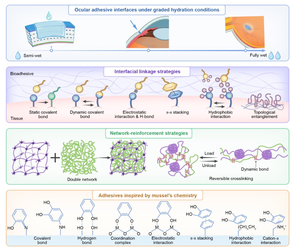 研究團隊介紹,眼科粘合材料分為眼表粘合和眼底粘合兩大類,針對性解決不同眼部區(qū)域的治療需求。對于角膜等眼表疾病,“生物膠水”已展現出亮眼潛力,能實現無縫線角膜移植,填充修復大范圍角膜缺損,即便在濕潤、滲血的復雜創(chuàng)面上也能即時封閉,可大幅拓展眼表修復的適用場景,提升治療效果。
