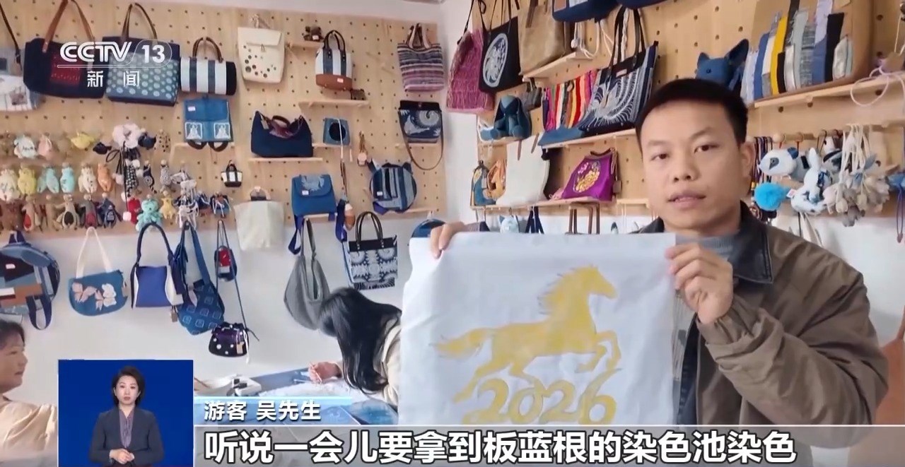 游客 吳先生:我畫的是一幅奔馬,聽說一會兒要拿到板藍根的染色池染色,脫蠟以后做成方巾。明年是2026年,祝大家馬到成功。