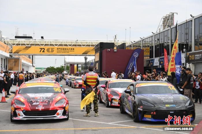 2025年11月13日,第72屆澳門格蘭披治大賽車開賽,澳門傳奇的“東望洋賽道”再度響起賽車引擎的轟鳴聲。圖為參加練習(xí)賽的賽車準(zhǔn)備出發(fā)?!≈行律缬浾?鄭嘉偉 攝