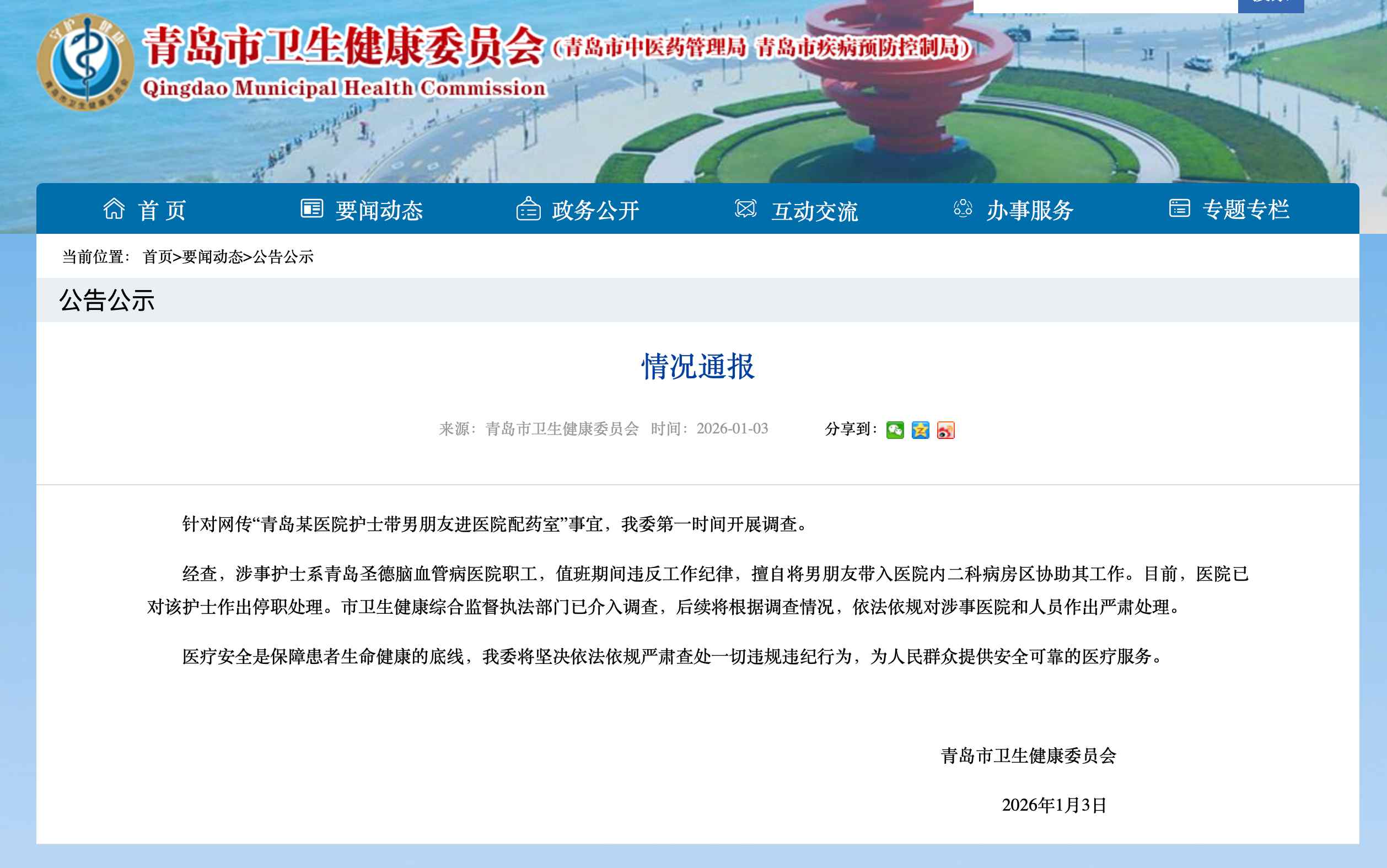 中國(guó)網(wǎng)1月3日訊 1月3日,青島市衛(wèi)生健康委員會(huì)發(fā)布情況通報(bào):針對(duì)網(wǎng)傳“青島某醫(yī)院護(hù)士帶男朋友進(jìn)醫(yī)院配藥室”事宜,青島市衛(wèi)生健康委第一時(shí)間開(kāi)展調(diào)查。