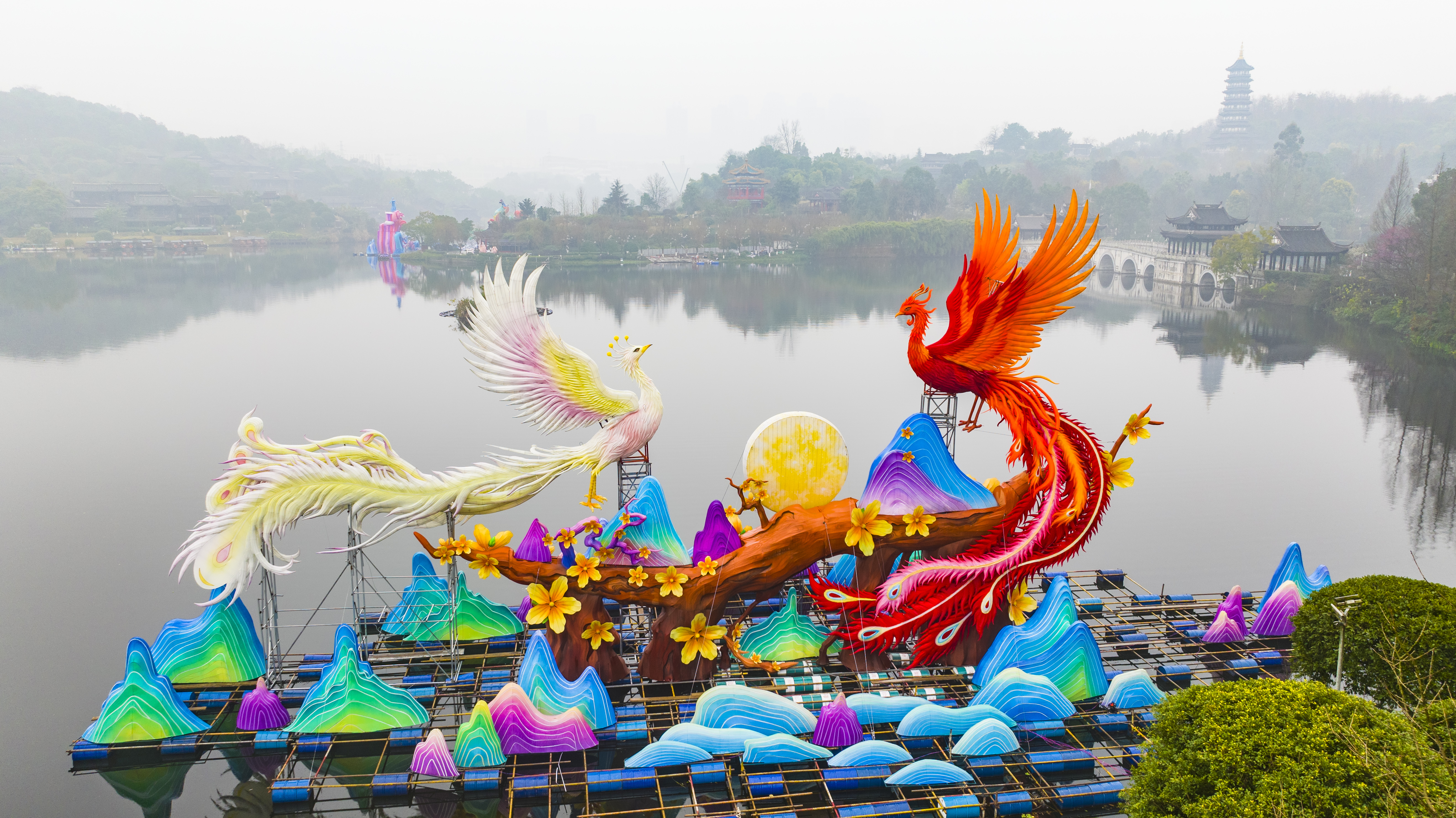 ▲重慶園博園,2026重慶市新春燈會——“禧歡霓”園博園大型水上燈會現(xiàn)場,來自重慶、自貢兩地的400余名匠人正并肩趕工,一盞盞色彩斑斕的燈組令人賞心悅目,新春氛圍感撲面而來。(無人機照片)記者 齊嵐森 攝/視覺重慶