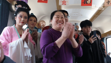 車廂里,國(guó)家級(jí)非遺沾化漁鼓戲現(xiàn)場(chǎng)開唱。旅客們都圍攏過來,在回家的路上聽了一段地道年戲。