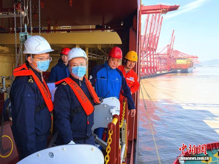 2月13日,寧波海關所屬北侖海關關員正在現(xiàn)場監(jiān)管保稅LNG加注情況。吳夢凱 攝