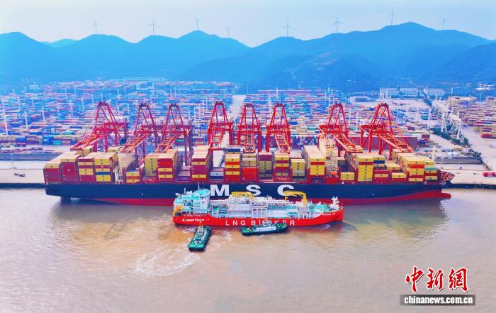 2月13日,LNG加注船“海洋石油302” 輪緩緩靠向集裝箱船“地中海史黛絲”輪。吳夢凱 攝