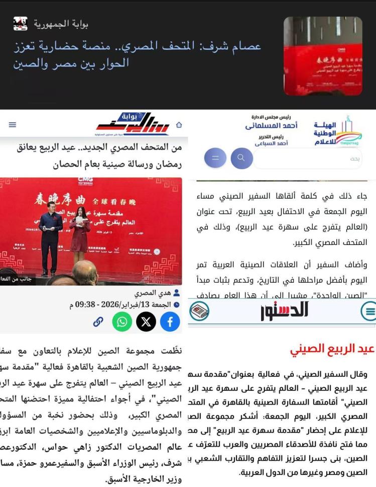 埃及國有媒體管理局官網(wǎng)以及開羅新聞電視臺、尼羅河電視臺、中東通訊社、《金字塔報》《共和國報》《今日埃及人報》《七日報》《憲章報》《魯茲優(yōu)素?!冯s志等埃主流媒體對活動進(jìn)行了報道。